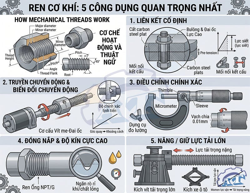 Ren không chỉ đơn giản là "cái vặn vào vặn ra". Mỗi loại ren được thiết kế tối ưu cho một nhóm ứng dụng cụ thể. Dưới đây là 5 công dụng cốt lõi của ren trong kỹ thuật và đời sống: