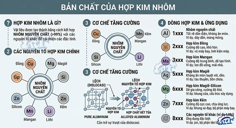 Nhôm nguyên chất (Al > 99%) thực tế rất mềm và dẻo, chỉ phù hợp làm dây điện hoặc lá nhôm thực phẩm. Để ứng dụng vào công trình và máy móc, người ta phải pha trộn nhôm với các nguyên tố khác như: Magie (Mg), Silicon (Si), Đồng (Cu), Kẽm (Zn)... tạo thành Hợp kim nhôm.