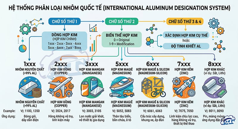 Hệ thống ký hiệu 4 chữ số của Hiệp hội Nhôm Quốc tế (AA) là "ngôn ngữ chung" toàn cầu. Hiểu các con số đầu tiên sẽ giúp bạn biết ngay đặc tính cốt lõi của thanh nhôm: