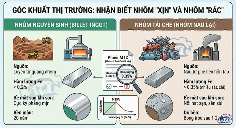 Nhôm nguyên sinh (Billet Ingot): Được luyện trực tiếp từ quặng nhôm. Độ tinh khiết cao, tạp chất sắt (Fe) thấp (< 0.2%). Nhôm này sơn lên cực kỳ phẳng mịn, bền màu 20 năm.