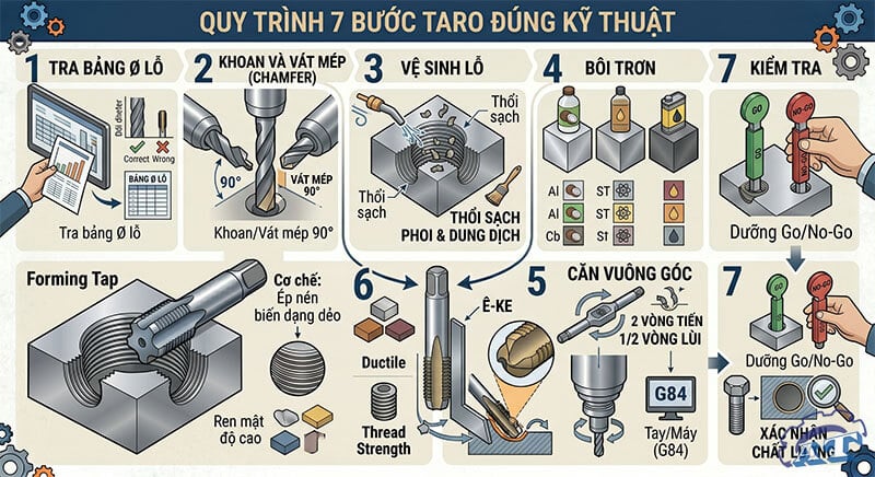 Lưu ý: Lỗ khoan cho taro nén phải lớn hơn taro cắt vì kim loại cần không gian để "trồi lên" tạo đỉnh ren.