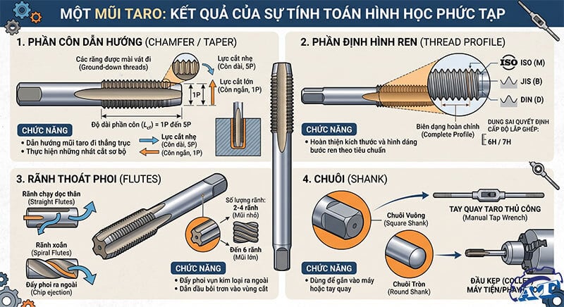 Một mũi taro không chỉ là một thanh sắt có răng; nó là kết quả của sự tính toán hình học phức tạp để đảm bảo lực cắt và thoát phoi tối ưu.