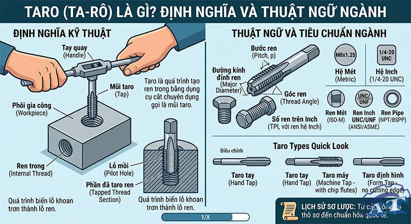 Hành động taro (Quy trình): Là việc xoay mũi taro vào lỗ khoan để biến bề mặt nhẵn của lỗ thành các rãnh ren theo tiêu chuẩn.