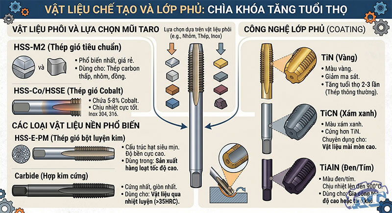 Lớp phủ giúp giảm ma sát và ngăn kim loại dính vào mũi taro:
